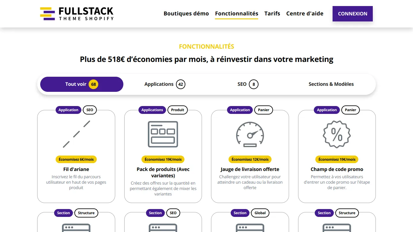 Imaginez économiser plus de 518€ par mois en réduisant vos coûts d'application tout en dynamisant votre marketing! Le Thème Shopify Fullstack enrichit votre boutique avec des applications intégrées telles que des boutons d’ajout au panier depuis les collections, des pastilles de couleur pour la sélection de produits et des témoignages entièrement personnalisables pour renforcer la confiance des consommateurs. De plus, les outils SEO vous permettent d'améliorer continuellement votre visibilité. Chaque détail est pensé pour encourager la conversion tout en vous offrant une liberté créative sans pareil.